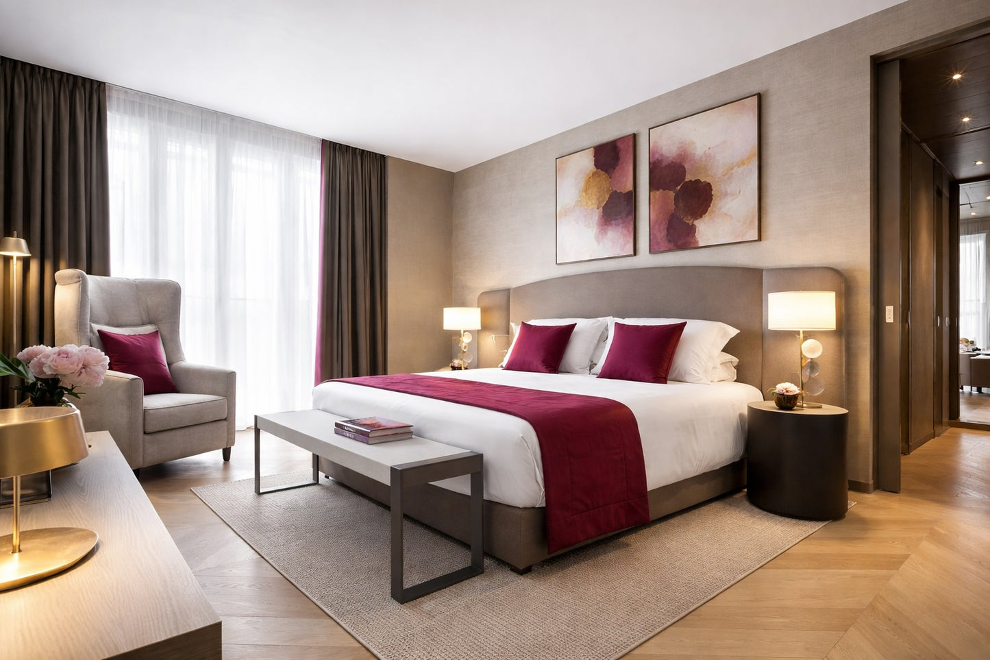 Diese edlen Vorhänge aus beigem Samt vereinen zeitlose Eleganz mit professioneller Funktionalität. Der weiche, schwere Stoff sorgt für eine luxuriöse Optik, eine angenehme Raumakustik und effektive Verdunkelung – perfekt für stilvolle Hotelzimmer, Suiten oder Loungebereiche.